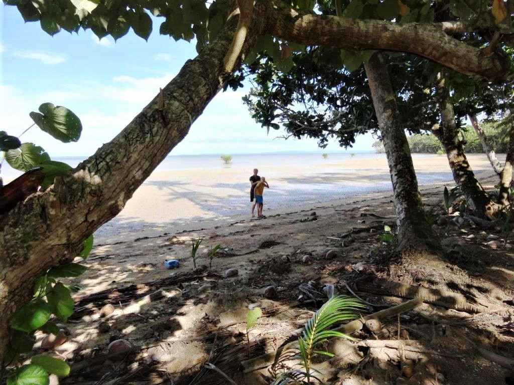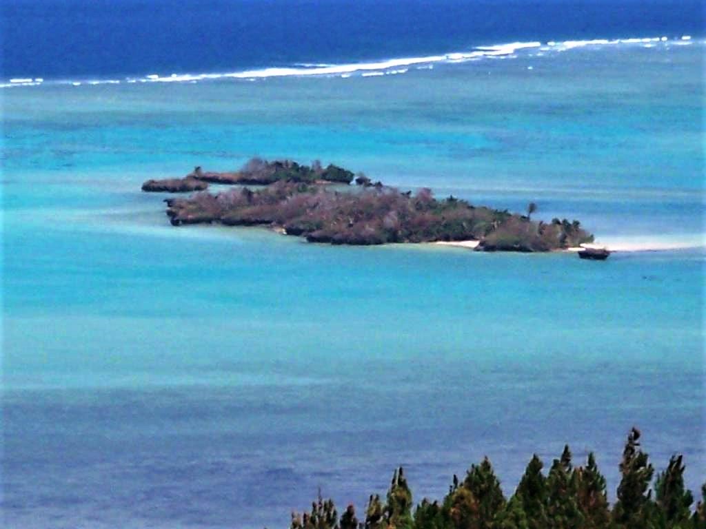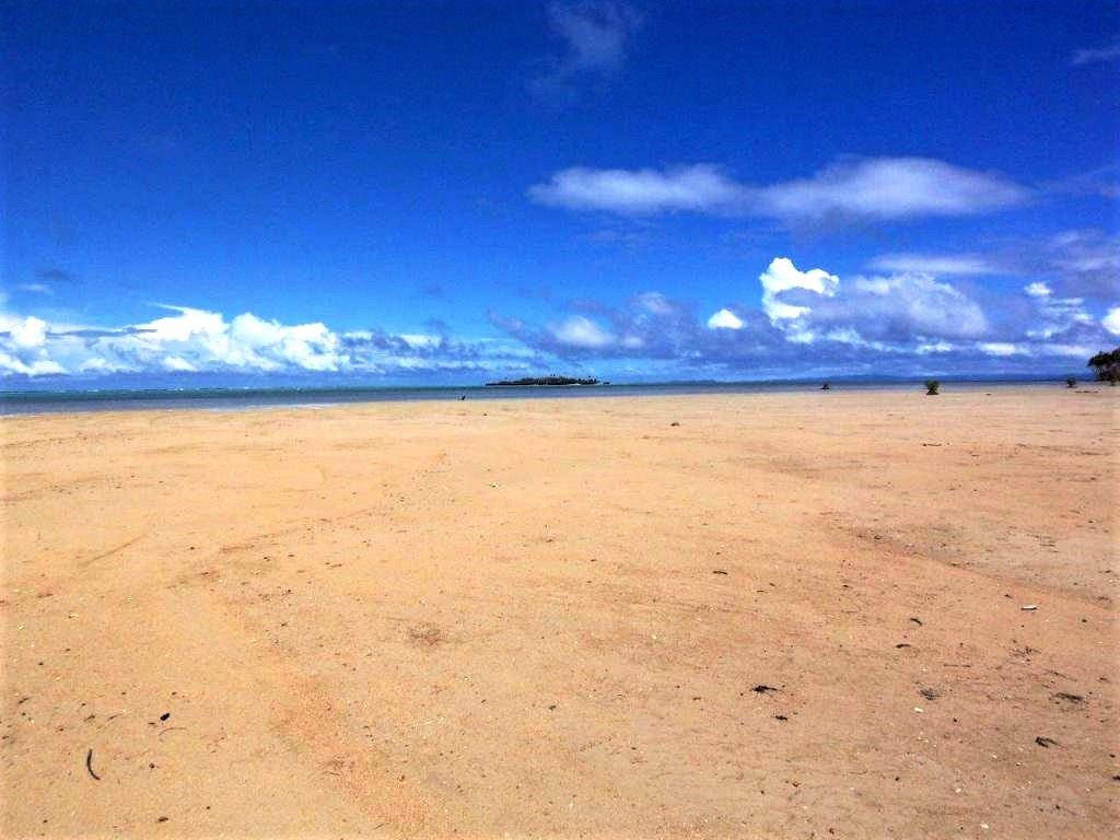 It has beachfront and with an island right of the shore before you within the reef protecting barrier about. The beach is huge and sand all the way out and into the deeper water.