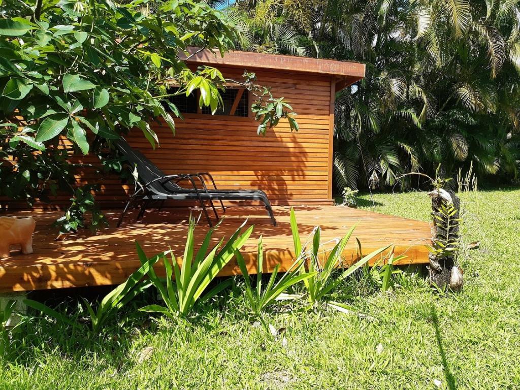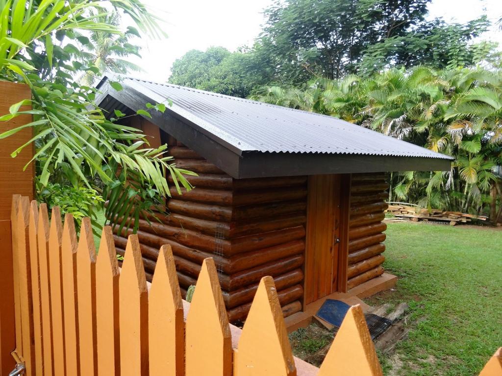 There is a professionally built real log cabin behind the home. It is 9’X12’ on a concrete pad and used for storage and a workshop. The back, or side yard as it is, is green grass with a stairway down the sloping lawn to another level with a large assortment of fruit trees, many palms and tropical decorative vegetation.