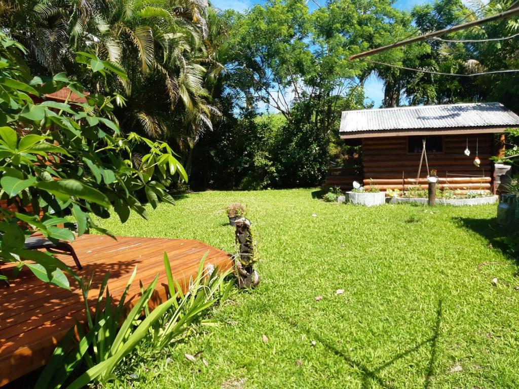 There is a professionally built real log cabin behind the home. It is 9’X12’ on a concrete pad and used for storage and a workshop. The back, or side yard as it is, is green grass with a stairway down the sloping lawn to another level with a large assortment of fruit trees, many palms and tropical decorative vegetation.