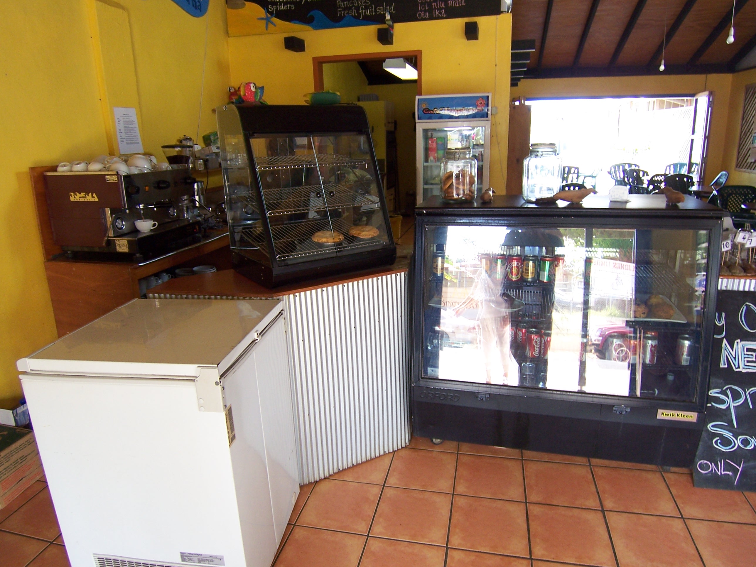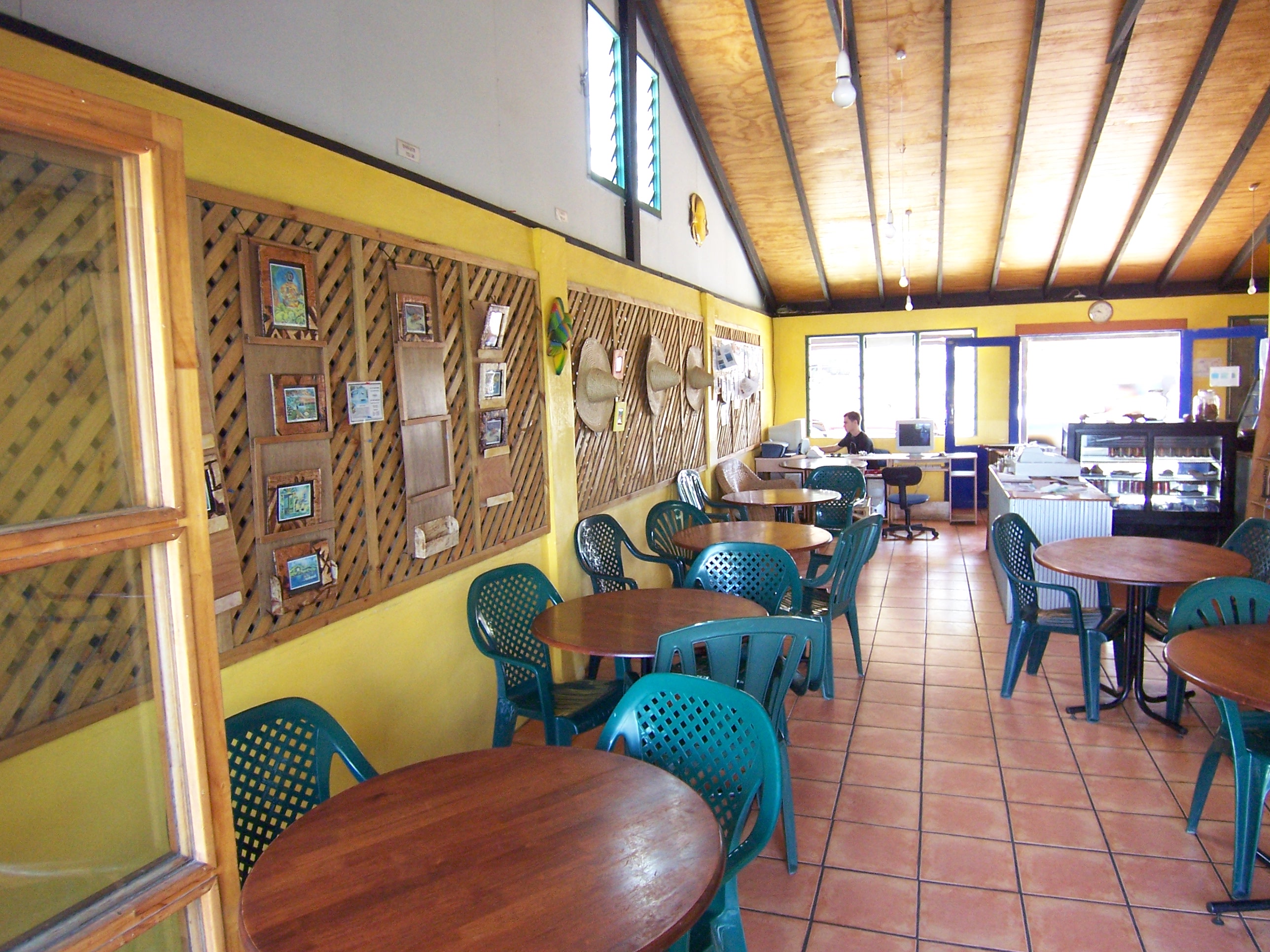 The indoor area and comprises seven internet stations a reading lounge, fully equipped kitchen, laundry room, booking agency, icemaker, several storage areas, video projector stand/screen, bakery area and a service and counter area totalling 105 metres square (1,143 square feet). At present the seating accommodates 20 customers. Cafe Tropicana is the largest indoor cafe in Vava'u and is a venue much in demand for gatherings of all kinds due to the space available.